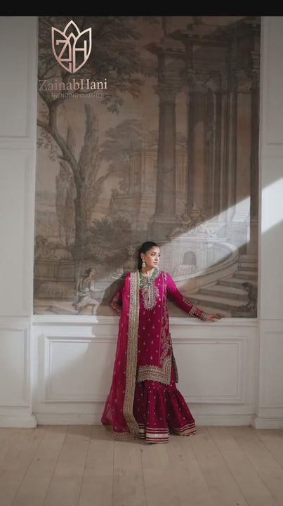 Elevate your formal wardrobe with this exquisite ZainabHani luxury formal ensemble, crafted to reflect timeless elegance and refined craftsmanship. Designed in a rich deep maroon tone, this outfit is perfect for weddings, festive occasions, and formal gatherings.